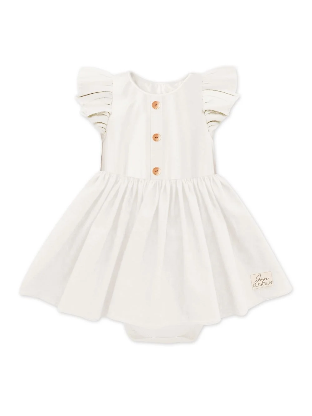 Šaty vhodné na teplejšie dni, určite ich využije aj pri slávnostných príležitostiach alebo na svadbe, kde vaša slečna bude ako princezná. Šaty majú krátke rukávy vo forme volánov. Oblúkový výstrih v hornej časti a zapínanie na drevené gombíky. Prestrihnuté sú v páse a majú nazberkanú sukničku. Pod sukničkou sa nachádza body časť, ktorú viete pohodlne rozopnúť na patentky, čo uľahčuje prebaľovanie bábätka.