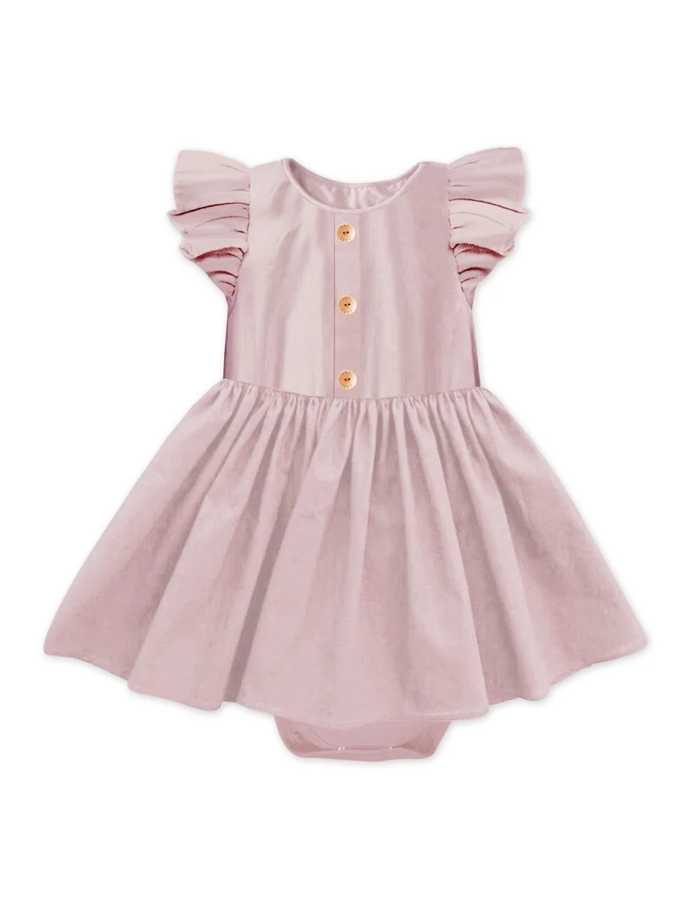 Šaty vhodné na teplejšie dni, určite ich využije aj pri slávnostných príležitostiach alebo na svadbe, kde vaša slečna bude ako princezná. Šaty majú krátke rukávy vo forme volánov. Oblúkový výstrih v hornej časti a zapínanie na drevené gombíky. Prestrihnuté sú v páse a majú nazberkanú sukničku. Pod sukničkou sa nachádza body časť, ktorú viete pohodlne rozopnúť na patentky, čo uľahčuje prebaľovanie bábätka.