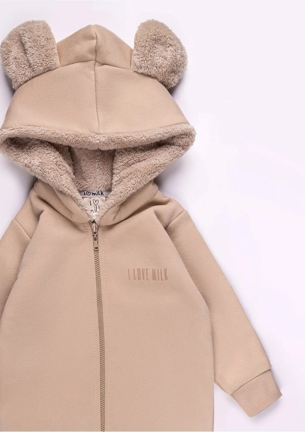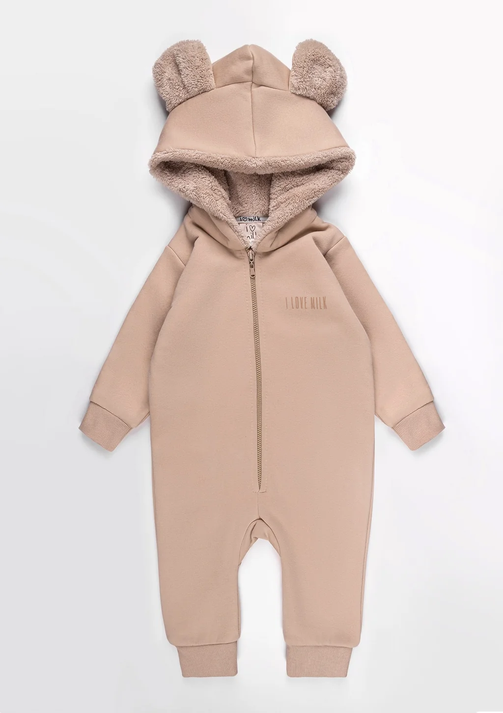 V chladnejšom období tento béžový overal spríjemní čas oddychu každému bábätku. Odev sa dá pohodlne zapnúť na zips. Ozdobou dizajnu je praktická kapucňa s roztomilými uškami, zvnútra podšitá jemným plyšom.