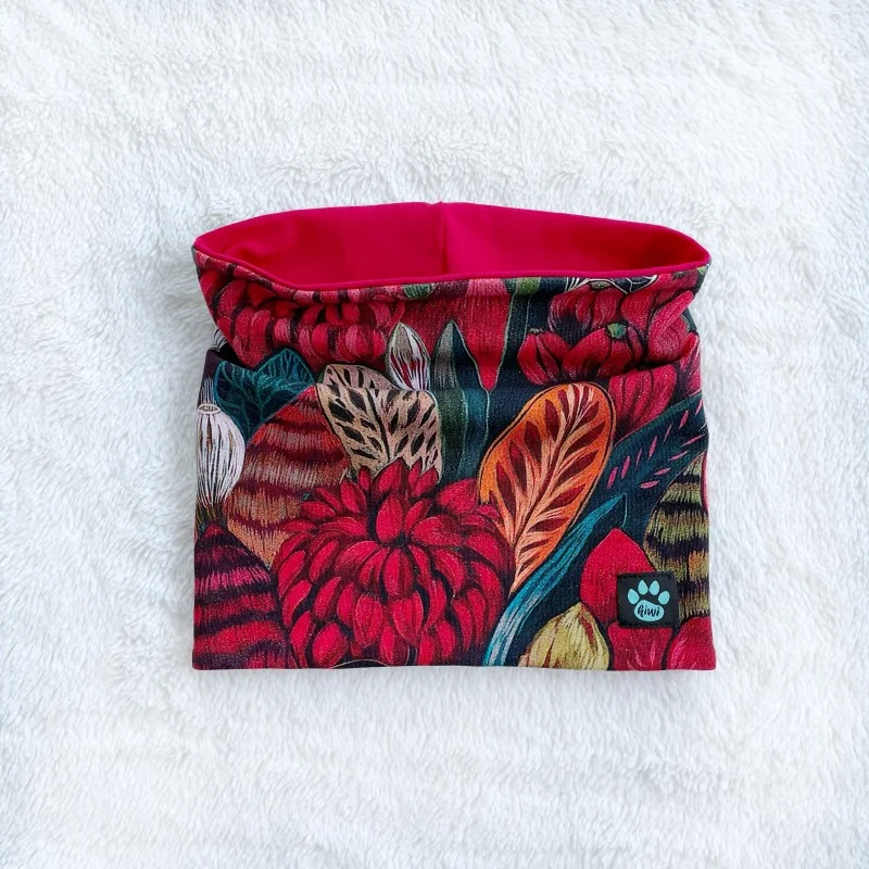 Dvojvrstvový nákrčník (tunel) z dizajnového bavlneného úpletu, podšitý jednofarebným úpletom. Prevlieka sa cez hlavu na jeden krát.
