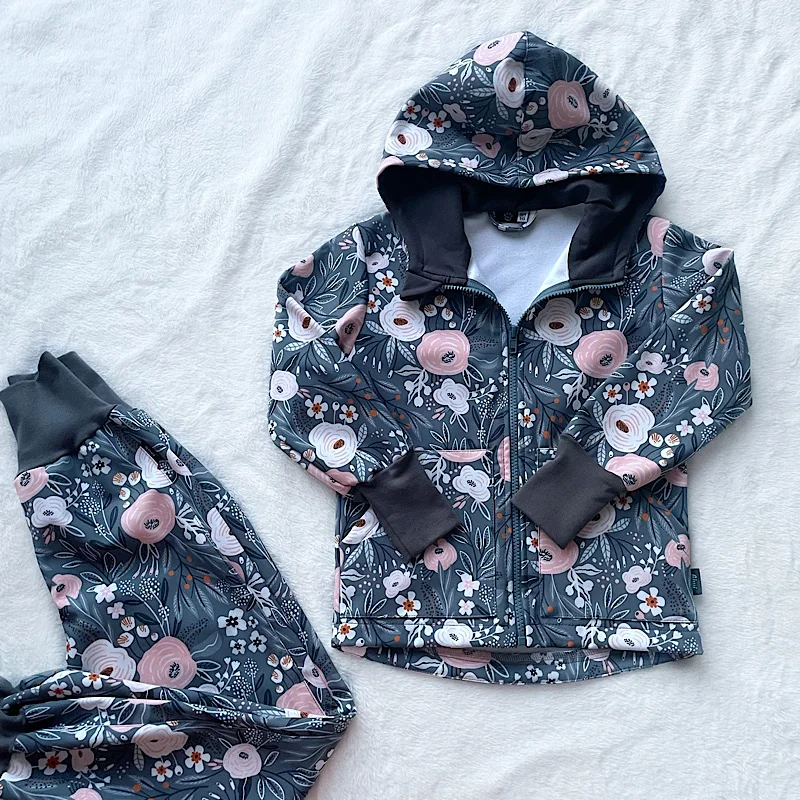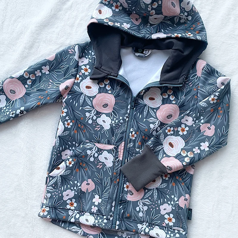 Kiwi softshellová bunda – ružové kvety na šedom