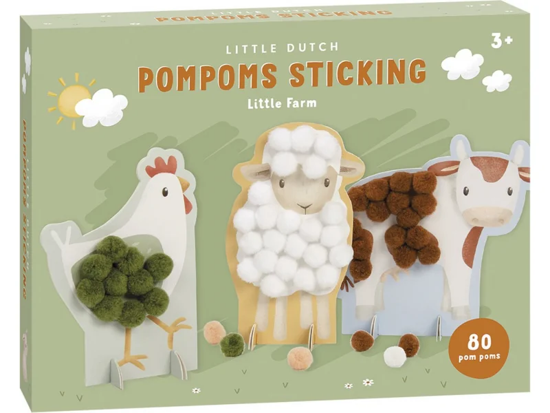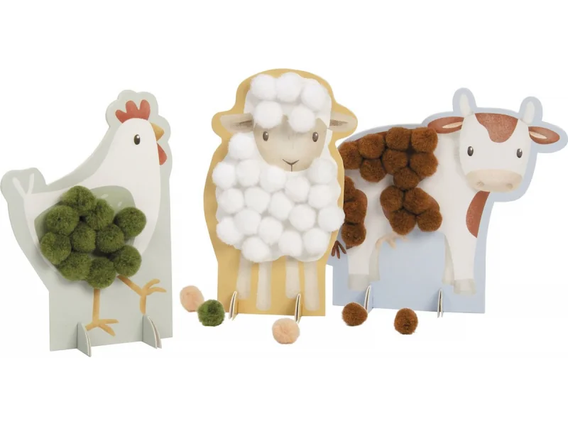 Originálna sada obsahuje 80 brmbolcov v rôznych farbách a štyri kartičky v podobe sliepočky, kravičky, ovečky a prasiatka. Kartičky majú samolepiaci povrch, na ktoré dieťa lepí brmbolce v správnych farbách. Po dokončení zvieratka vďaka stojanu samostatne stojí a môžete ich využiť ako krásnu dekoráciu v detskej izbe.