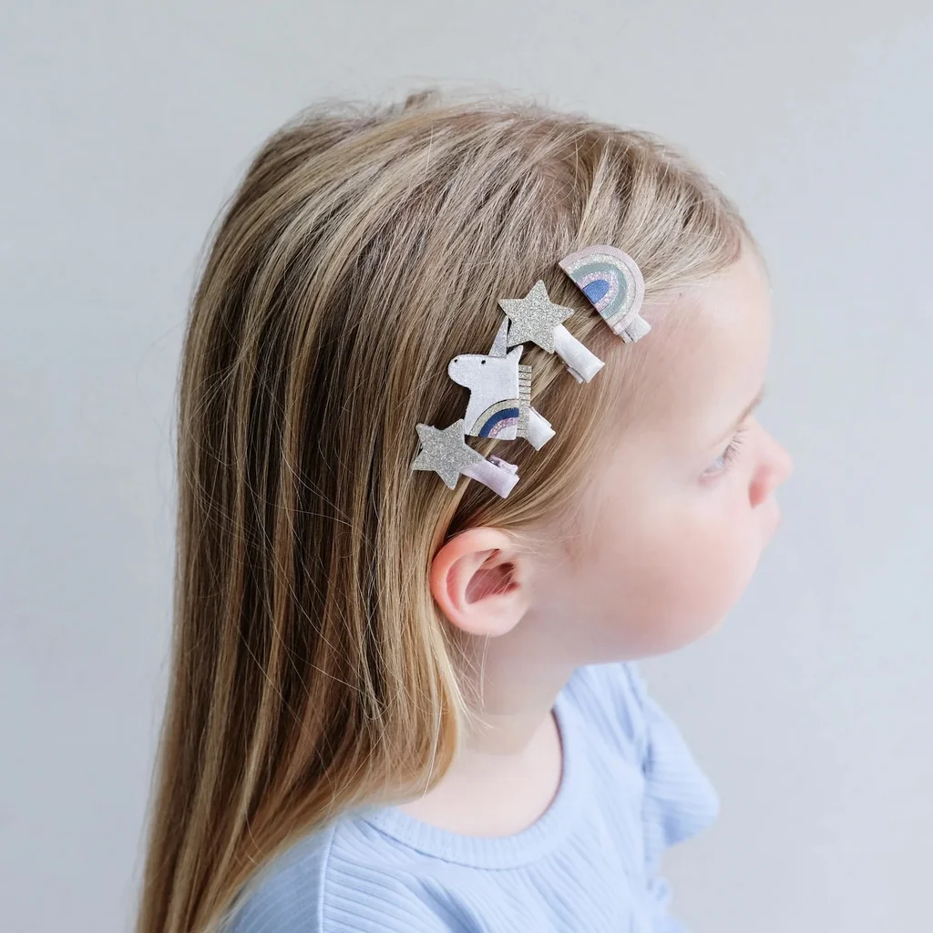 Dodajte účesu rozprávkovú mágiu s našimi Celeste jednorožcovými mini sponkami! Jemné jednorožce, dúhy a hviezdičky v najkrajšej palete ružových a pastelových odtieňov vytvoria vzhľad, ktorý si určite zamilujú.