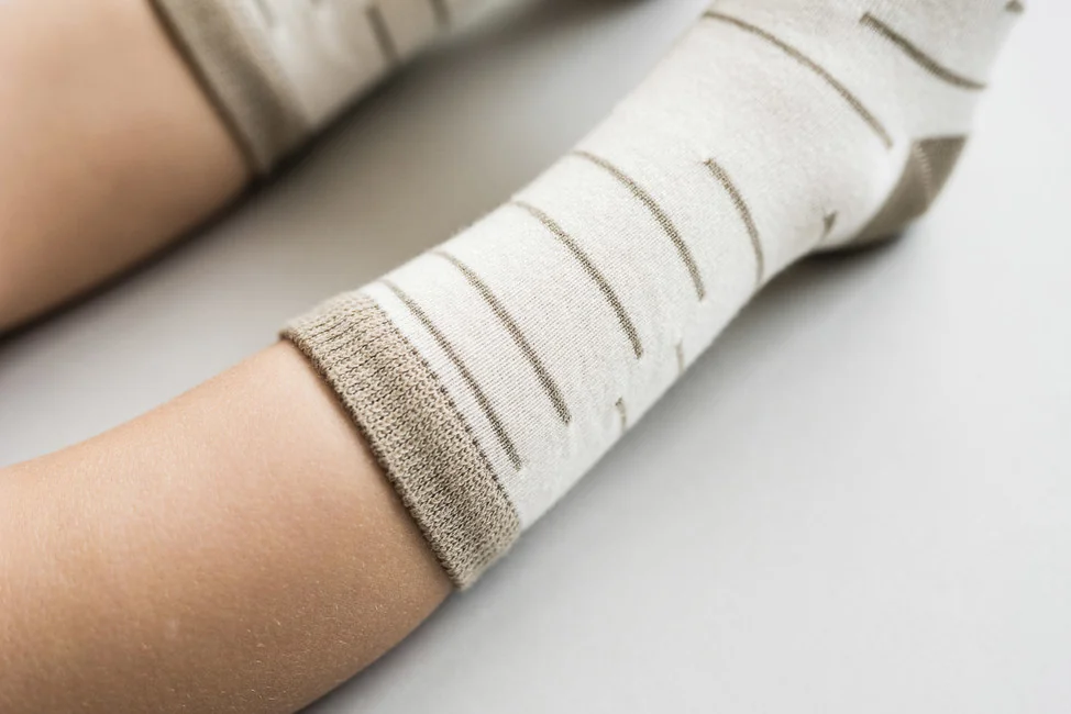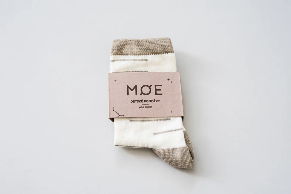 Béžové ponožky s jemnými svetlo-hnedými pásikmi. Ponožky s neutrálnym vzorom brezy ľahko zladíte so zvyškom šatníka.