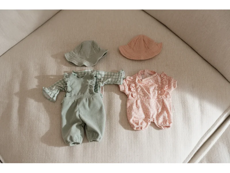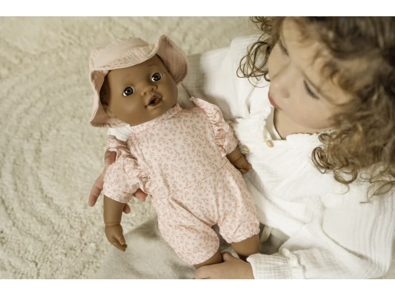Krásna sada oblečenia s nežnou kvetinovou potlačou pre bábiku Little Dutch Baby obsahuje overal s krátkymi nohavicami a klobúčik.