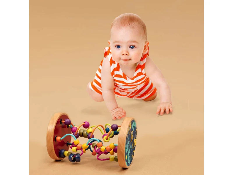 Valec s posuvnými korálkami v krásnom drevenom prevedení láka na hranie aj na pozorovanie. 48 farebných drevených korálikov na piatich drôtených dráhach sa pohybuje pri otáčaní hračky alebo ich dieťa posúva svojimi prstíkmi.