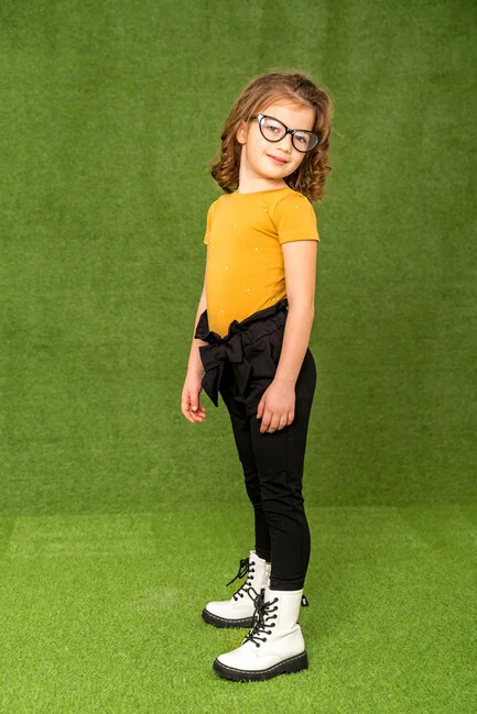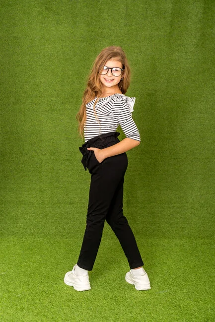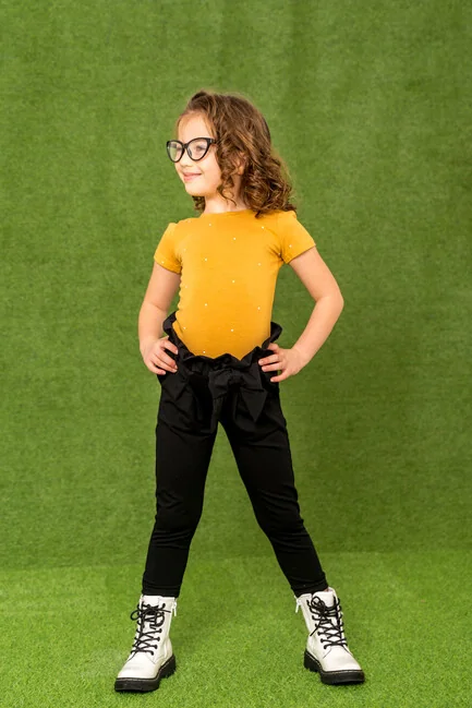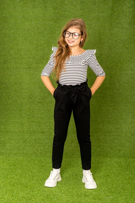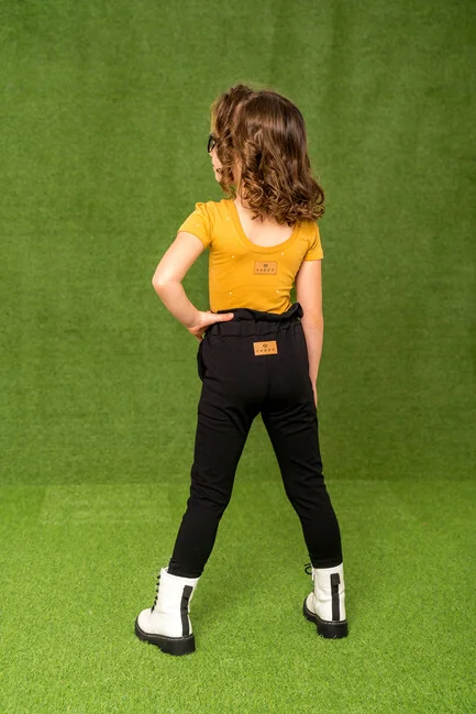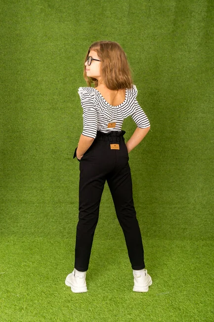 Špotovo – elegantné nohavice s mierne zvýšeným pásom. Obojstrannými skladmi na prednej časti a jemne riaseným volánom nad pásom elegantne dopĺňa mašľa , ktorú je možné vybrať a nosiť aj bez nej. Veľmi pohodlné a moderné.