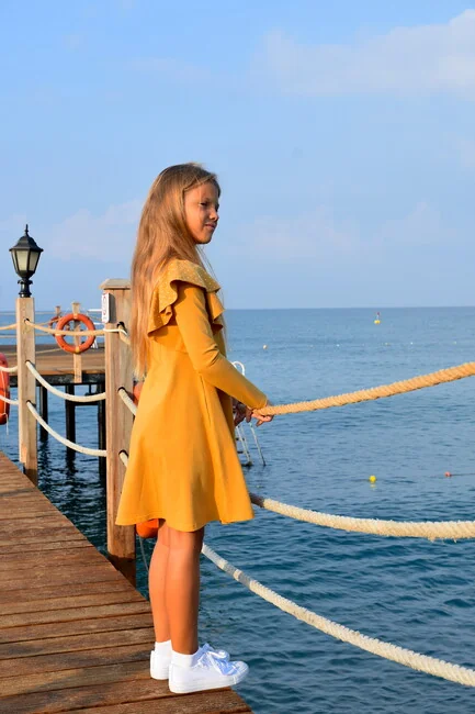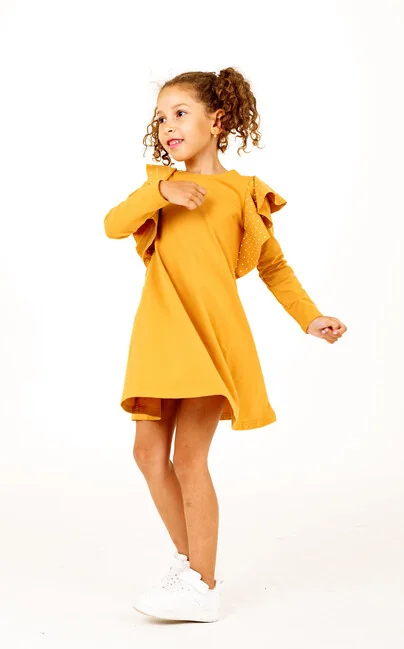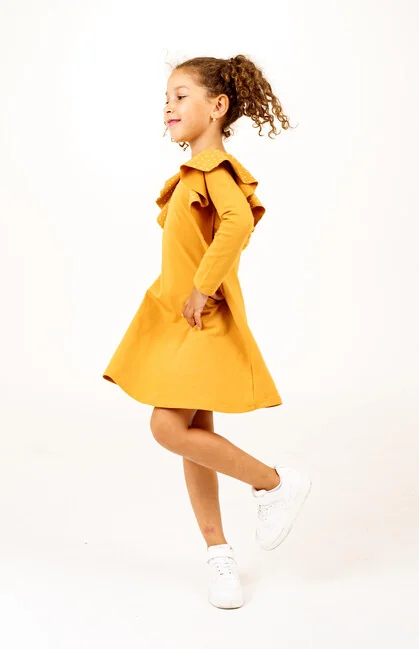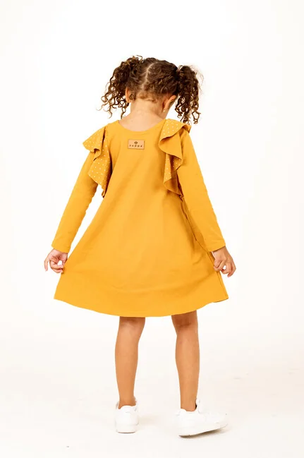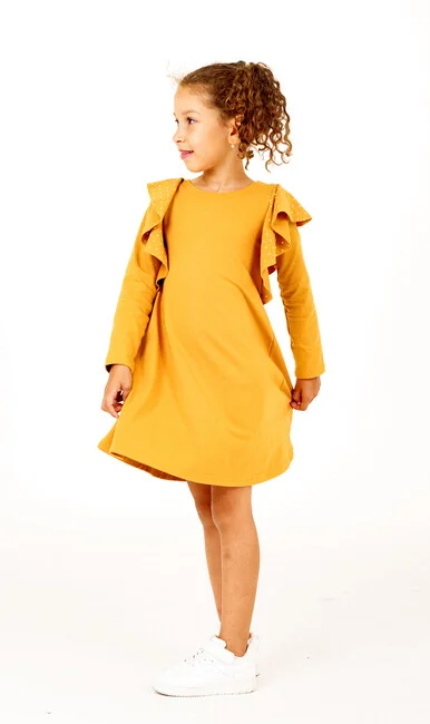 Ležérne jesenné šaty ANGEL s padavými volánmi na vrchnej časti dlhých rukávov. Á-čkový strih šiat pristane štíhlejšej aj pevnejšej postave. Strih je pohodlný a nijak neprekáža pri jesenných prechádzkach alebo posedeniach.