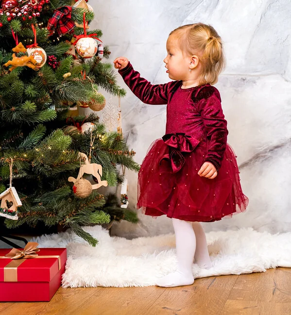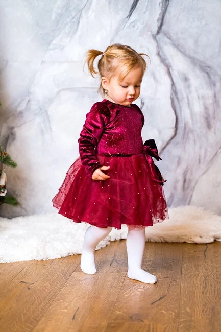 Nadýchané a pohodlné šaty so sukničkou posiatou trblietavými perličkami. Husto riasený tyl sukne dodáva šatám ľahučký a bohatý vzhľad. Vrchná časť je zdobená romatickou pevne prichytenou mašličkou.